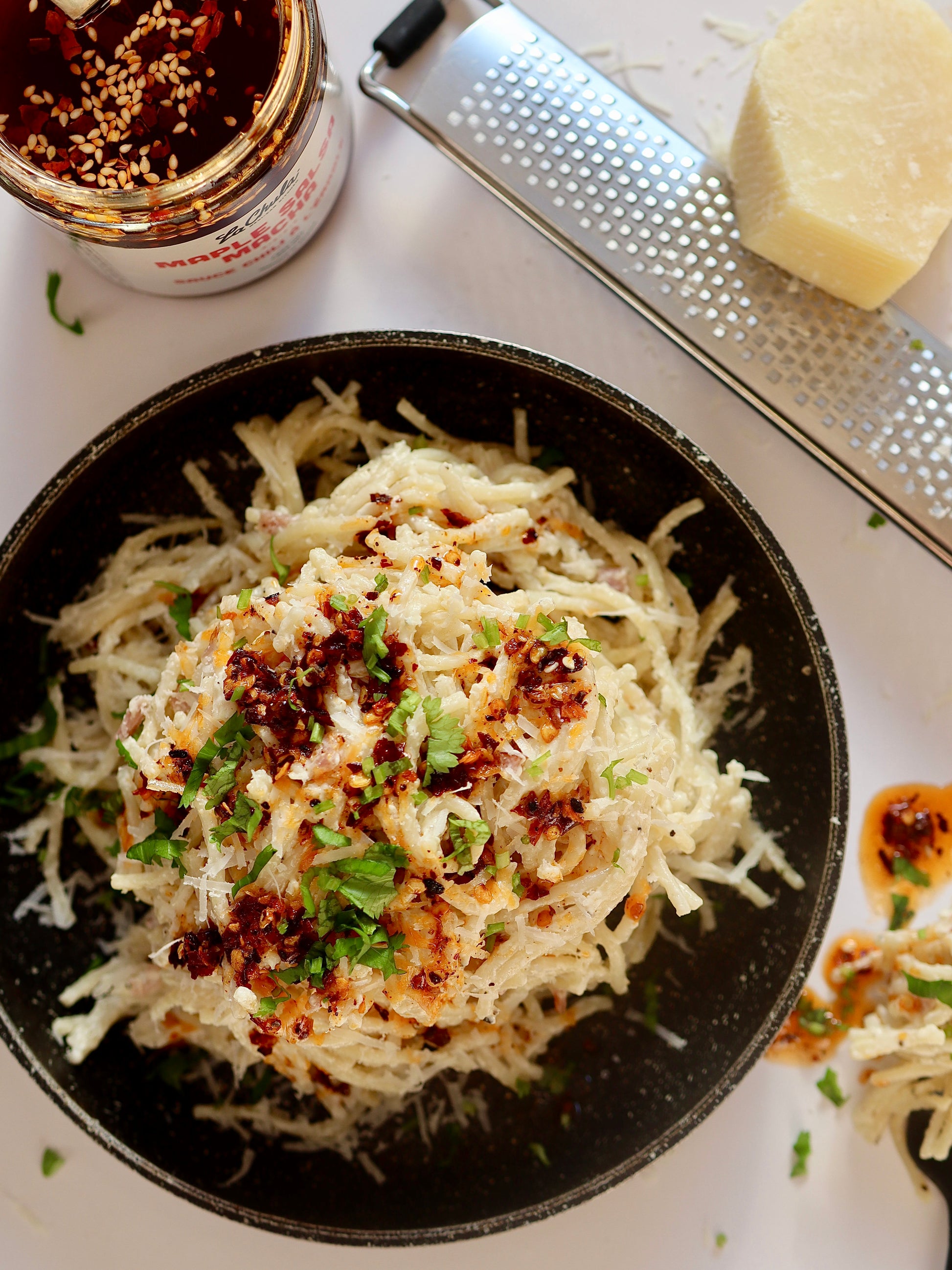 Spicy, slightly sweet chili oil, highly addictive. Perfect with eggs, pasta, tacos, soups, salads, pretty much anything! Try it now, thank me later.